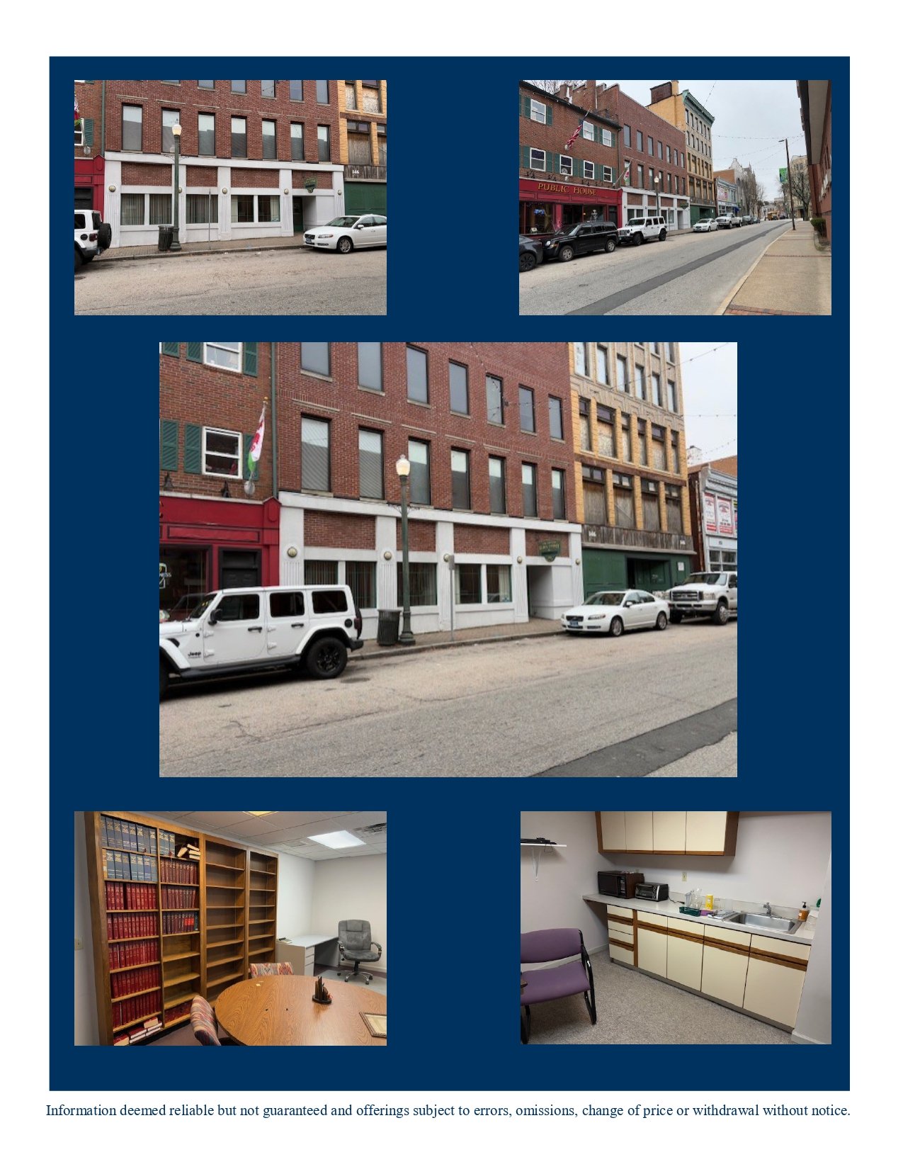 Nice first floor former attorney’s office of Block & Janney. The 2,646sf space includes two baths, a kitchen, a large conference room, and two open areas which can be divided into private offices. (Second and third floor nice offices may be added on.)  Also, the first-floor space may be enlarged. Located across the street from the courthouse and a quick walk to the waterfront. Next door to the Harp & Dragon Pub. On-street parking; public lot available. For Lease $2,400/mo + utilities.
