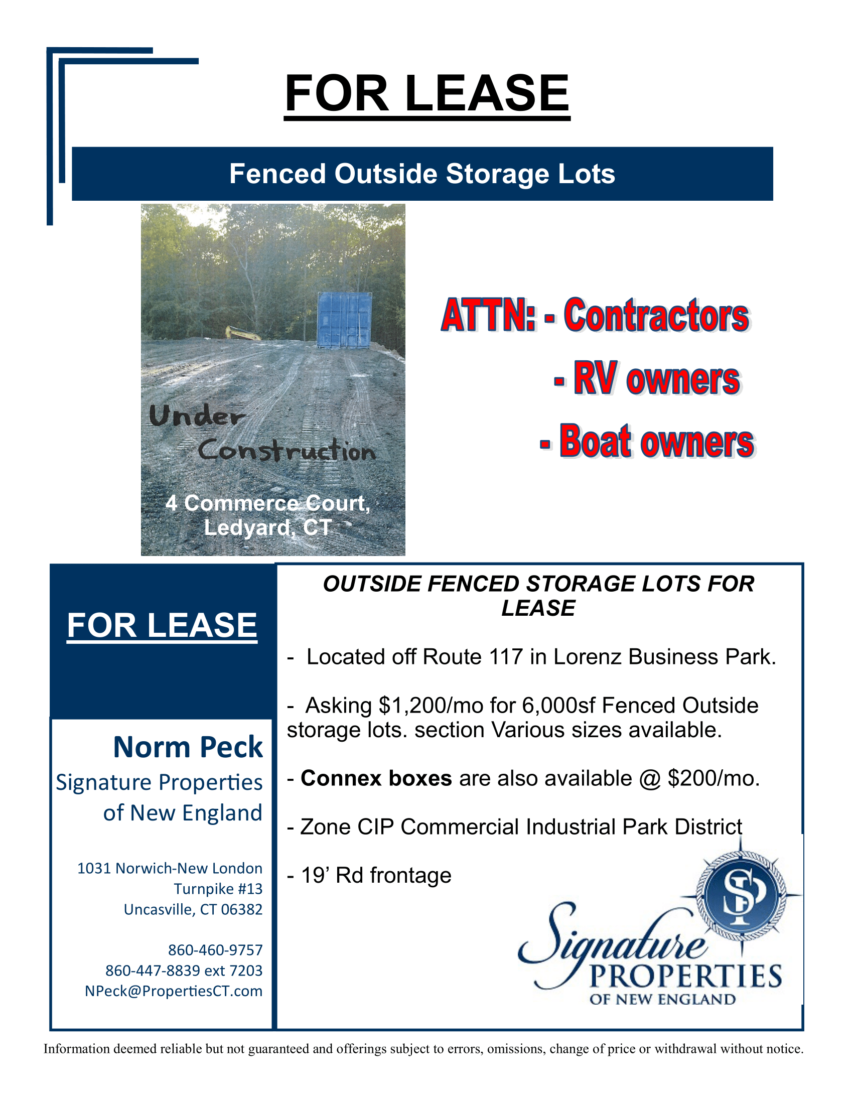 Attention Contractors! Fenced outside storage lots. Sizes can vary. Asking $1,200/mo for 6,000sf section. Connex boxes are also available @ $180/month.