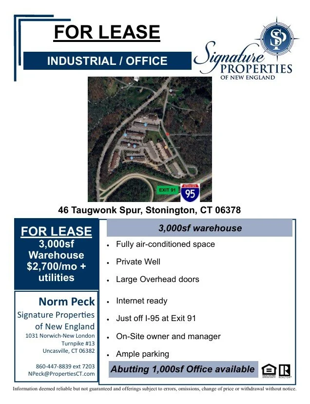 The Industrial park located at Taugwonk Spur, Stonington now has available a 3,000sf warehouse with large over-head doors. $2,700/mo plus utilities. Abutting 1,000sf office available as well.