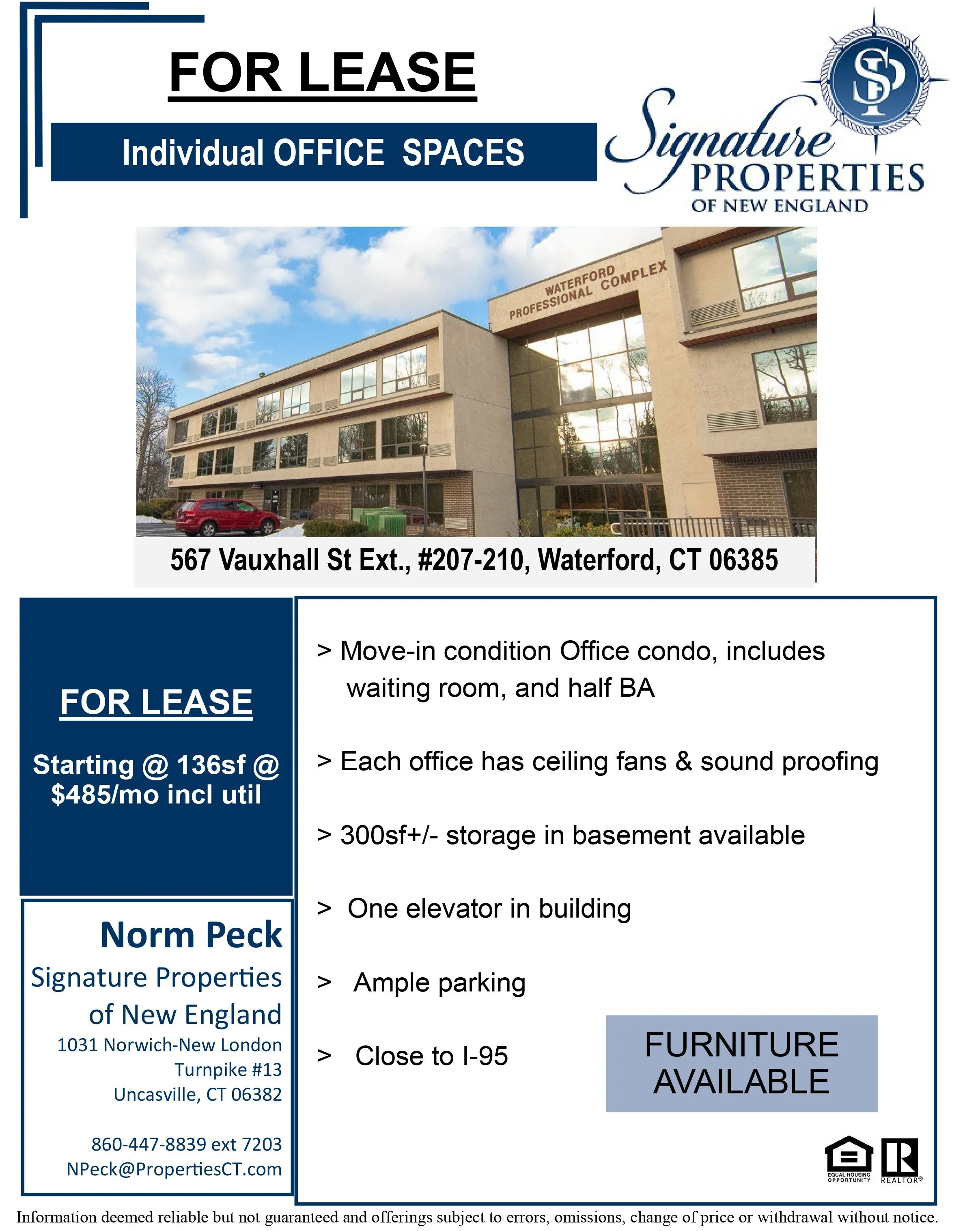 Each office has ceiling fans and soundproofing. Building has elevator. Rent starts @ $485/mo incl utilities.  Ample parking, and located just off I-95. Move-in condition. Furniture available.