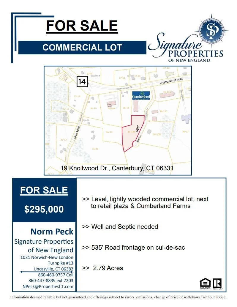Level, lightly wooded commercial lot, next to retail plaza and Cumberland Farms. 2.79 acres. 535’ road frontage. Zone VC Village Commercial. Both Well and Septic needed. $295,000.