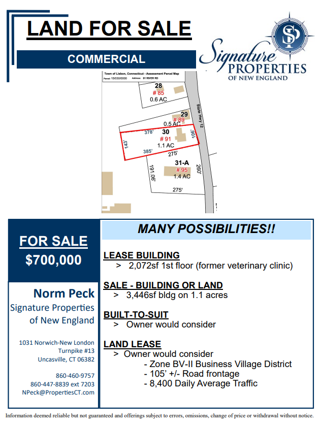 Land for sale $700,000 just off I-395 near Lisbon Landing retail district, where a former veterinary clinic was. Currently 2,072sf office and 1 apartment in the basement on 1.1 ac with 105+/-ft road frontage. Zone BV-II. Good visibility and easy access. 8,400 ADT counts. Expandable parking area. Neighbors include McDonald’s, Auto Zone, Citco, and two other convenience stores. Great retail re-development parcel. The owner would build-to-suit or land lease as well. The land is level and all buildable