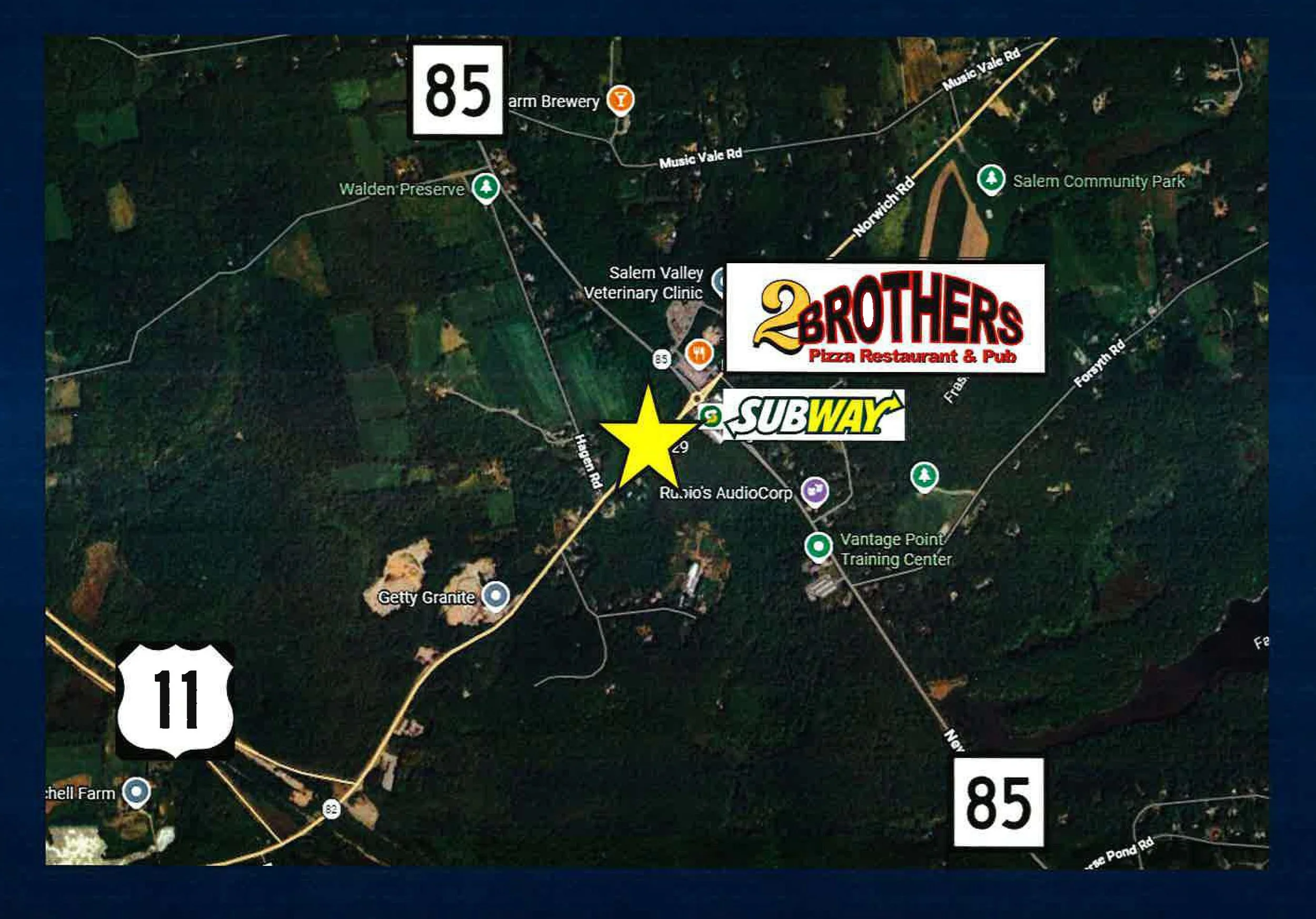 DIRECTIONSI-395 S Exit 2. Turn right onto Route 85. About 8 miles, enter Salem Four Corners Roundabout, turning left on Route 82. Just on left.