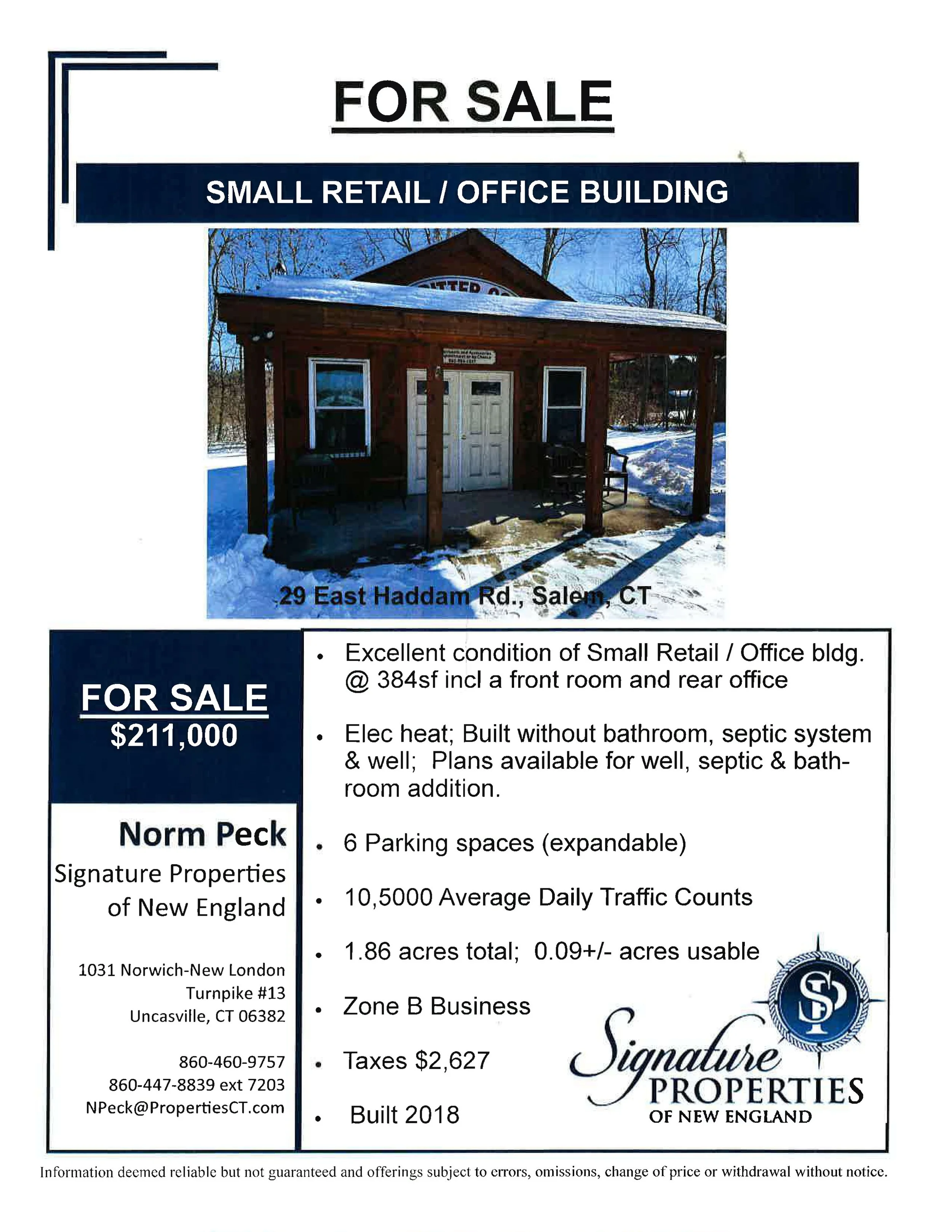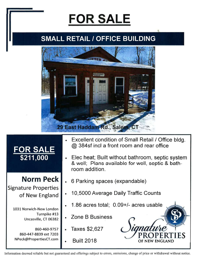 Small retail / office building is just off access to Route 11. Very good condition. Built without bathroom, septic system, and well.  Front room & rear office. Plans available for well, septic & bath addition.  Expandable parking area. Highly visible and good traffic count.  Close to Salem Valley Farms. Currently known as the “Critter Cop”.  Central alarm system. For Sale $211,000.