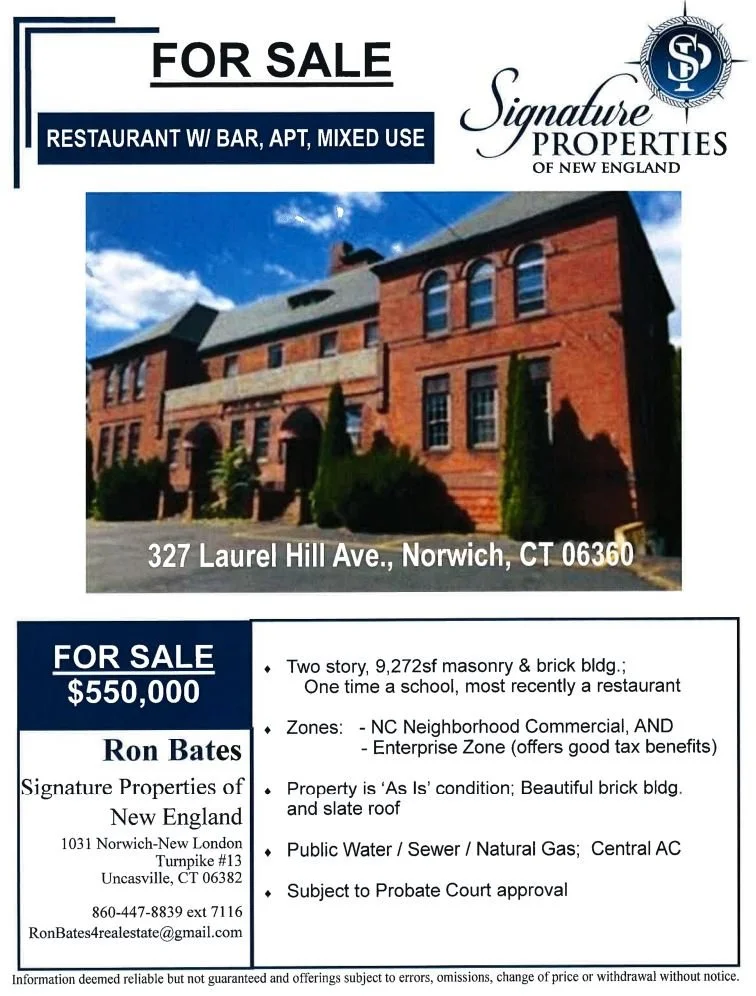 For Sale, a two story 9,272 square foot masonry and brick building that was at one time a school, and most recently a restaurant. Handicap access, plenty of paved parking. There appears to be approximately 44 parking spaces. Located in an NC (Neighborhood Commercial) Zone, there are a number of uses that are possible including restaurant with bar, hotel, apartments, mixed use, offices, to name some. Only 10 miles to the Navy Sub Base and 13.6 miles to Electric Boat. It is in an Enterprise Zone offering some good tax benefits. Property is being purchased in "as is" condition. Seller will make no additional repairs or upgrades. Buyer is to do their own due diligence regarding condition of this property. Subject to Probate Court Approval.